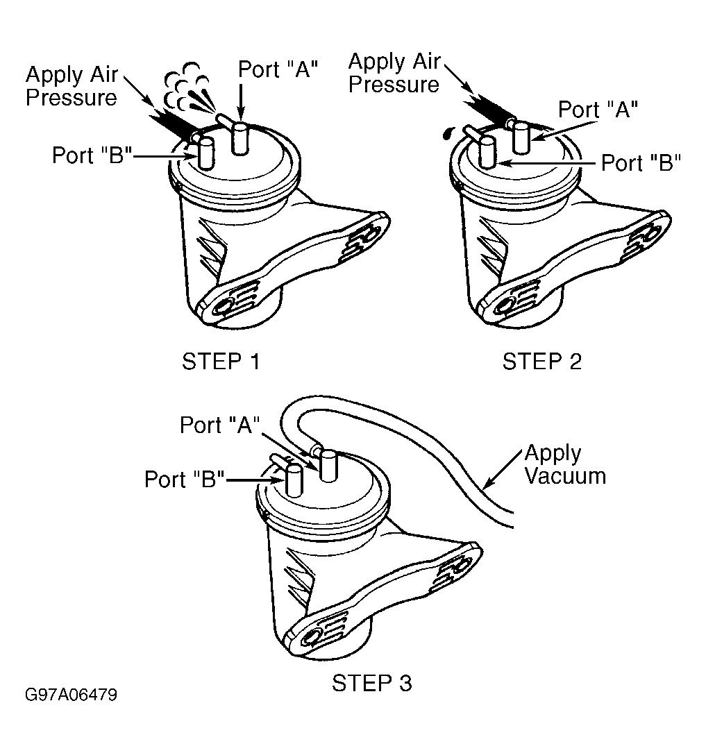 6. To test vacuum tank, disconnect hoses from vacuum tank. Vacuum tank is located near driver's side front corner of engine compartment, below battery tray. Apply air pressure to port "B" on vacuum tank. Ensure air flows from port "A". Perform STEP 1 in illustration. See Fig 4. Apply air pressure to port "A". Ensure air does not flow from port "B". Perform STEP 2 in illustration. See Fig 4.