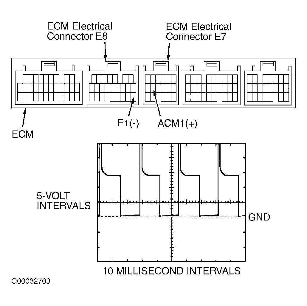 4. Remove glove box for access to Engine Control Module (ECM). For illustration of ECM location, see Figure. Connect oscilloscope leads between terminal ACM1 (Black wire) on ECM electrical connector E7 and terminal E1 (Brown wire) on ECM electrical connector E8. See Fig 2.