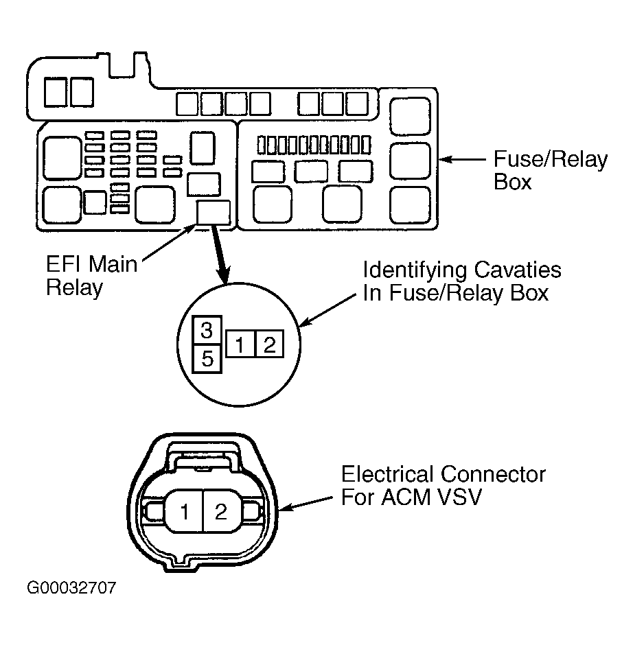 7. Ensure electrical connector at ACM VSV is still disconnected. Remove EFI main relay from fuse/relay box at driver's side front corner of engine compartment. See Fig 3. EFI main relay may also be referred to as EFI relay. To check for open in wiring between EFI main relay and ACM VSV, using ohmmeter, check resistance between cavity No. 3 (Black/White wire) in fuse/relay box for EFI main relay and terminal No. 1 (Black/White wire) on electrical connector for ACM VSV. Use care not to damage cavity for EFI main relay by applying excessive force on cavity when checking resistance. If resistance is one ohm or less, go to next step. If resistance is more than one ohm, repair open on Black/White wire between EFI main relay and ACM VSV. See ENGINE PERFORMANCE in SYSTEM WIRING DIAGRAMS article in ELECTRICAL.