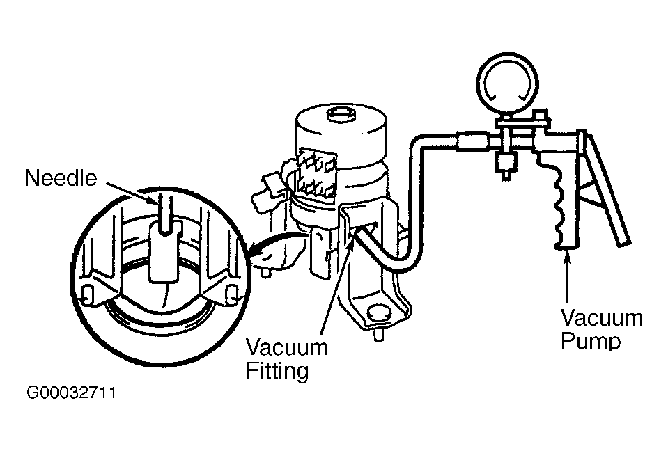 12. Disconnect vacuum hose from vacuum fitting on active control engine mount and connect vacuum pump to vacuum fitting. See Fig 4. Using vacuum pump, apply 25.0 in. Hg of vacuum to active control engine mount for at least one minute and check that no change exists is the needle movement. Needle is located at the bottom of active engine control mount. See Fig 4. Check for signs of fluid leakage on active engine mount. If active control engine mount operates properly, active control engine mount system is operating properly. If active control engine mount does not operate as specified or signs of fluid leakage exist, replace active control engine mount.