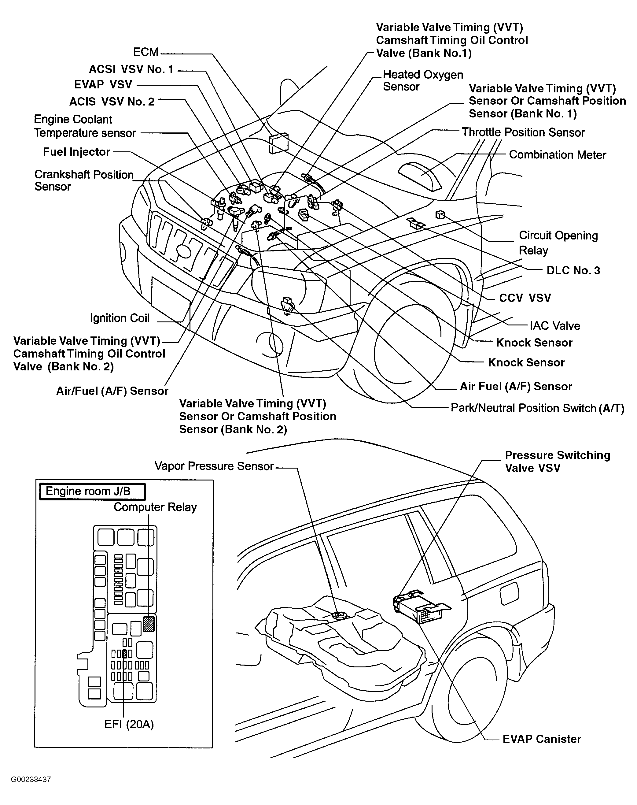 Fig 3: Locating EFI Main Relay, Identifying Cavities In Fuse/Relay Box & Identifying Terminals On Electrical Connector For ACM Vacuum Switching Valve (Highlander)