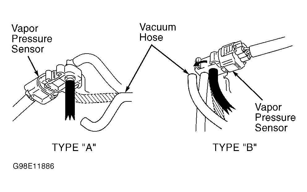 11. Turn ignition off. Using DVOM, backprobe ECM harness connector and measure voltage between terminal No. 17 (Blue/Black wire) at ECM harness connector E5 and terminal No. 18 (White wire) at ECM harness connector E8. See Figure. Disconnect vacuum hose from vapor pressure sensor. See Figure. Vapor pressure sensor is mounted above fuel tank, near fuel level sensor. Connect a vacuum pump to vapor pressure sensor. Turn ignition on. Voltage should be 2.9-3.7 volts without vacuum applied, and .5 volt or less with 1.18 in. Hg applied. If voltage is not as specified, go to next step. If voltage is as specified, go to step  13.