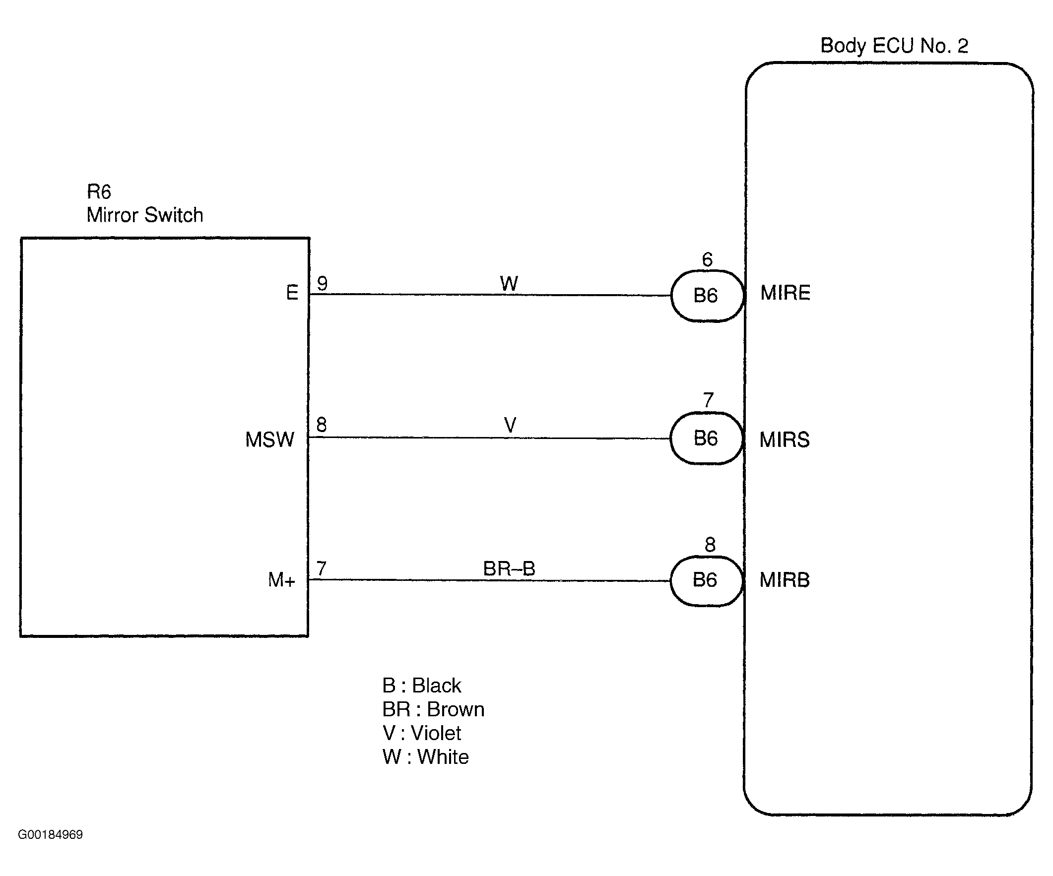 3. Check for short to power, short to ground and continuity in the wiring harness and connector between the mirror switch and body ECU No. 2. If the results are OK, inspect the body ECU No. 2. If the results are not OK, repair or replace the wiring harness or connector.
