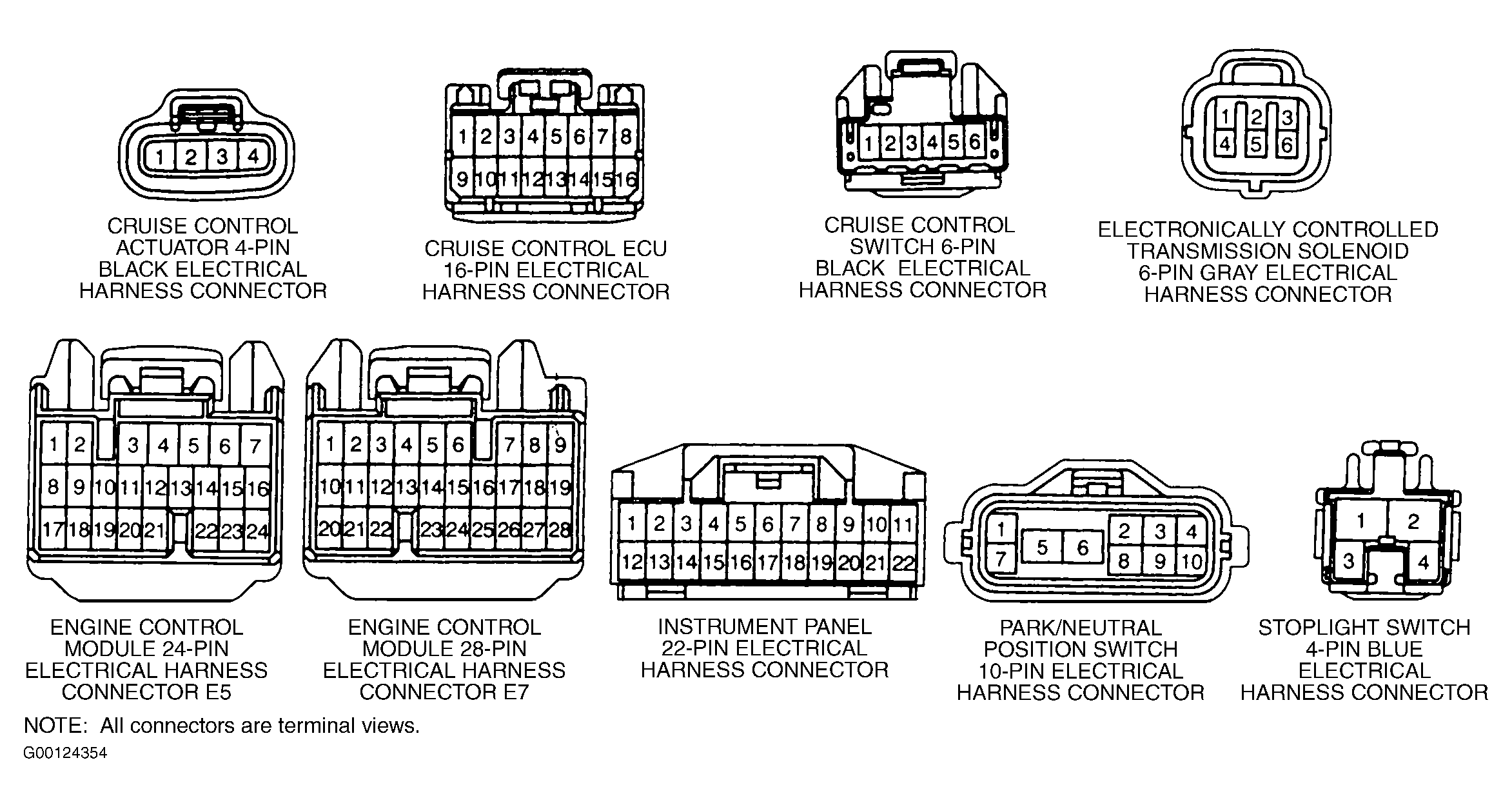 - Turn ignition off. Disconnect cruise control ECU 16-pin electrical harness connector and stoplight switch 4-pin Blue electrical harness connector. Using a DVOM, check for open circuit in Green/White wire between cruise control ECU 16-pin electrical harness connector terminal No. 2 and stoplight switch 4-pin Blue electrical harness connector terminal No. 1. See Figure. If wires, harnesses and connectors are okay, go to step 13. If wires, harnesses and connectors are not okay, repair fault as required. See CRUISE CONTROL in SYSTEM WIRING DIAGRAMS article. After repairs, perform confirmation test. See CONFIRMATION TEST .