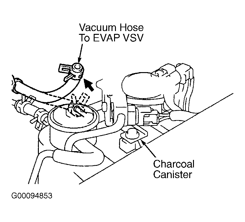 - Check vacuum hoses to charcoal canister, vapor pressure sensor, vapor pressure sensor VSV and EVAP VSV for correct installation, loose connections, restrictions, disconnected hoses and damage. See Figure. If no problems exist, go to next step. If any problem exists, repair or replace components as necessary.