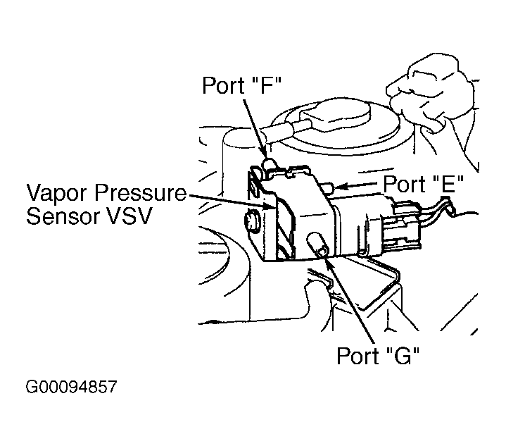 - To test vapor pressure sensor VSV operation, apply air pressure to port "E" on vapor pressure sensor VSV. See Fig 3. Air should flow from port "G" and not from port "F". Apply battery voltage and ground to electrical terminals on vapor pressure sensor VSV. Apply air pressure to port "E" on vapor pressure sensor VSV. Air should flow from port "F" and not from port "G". If vapor pressure sensor operates properly, go to next step. If vapor pressure sensor VSV does not operate properly, replace vapor pressure sensor VSV along with charcoal canister. Clean vacuum hoses between vapor pressure sensor VSV and charcoal canister, and between vapor pressure sensor VSV and vapor pressure sensor.