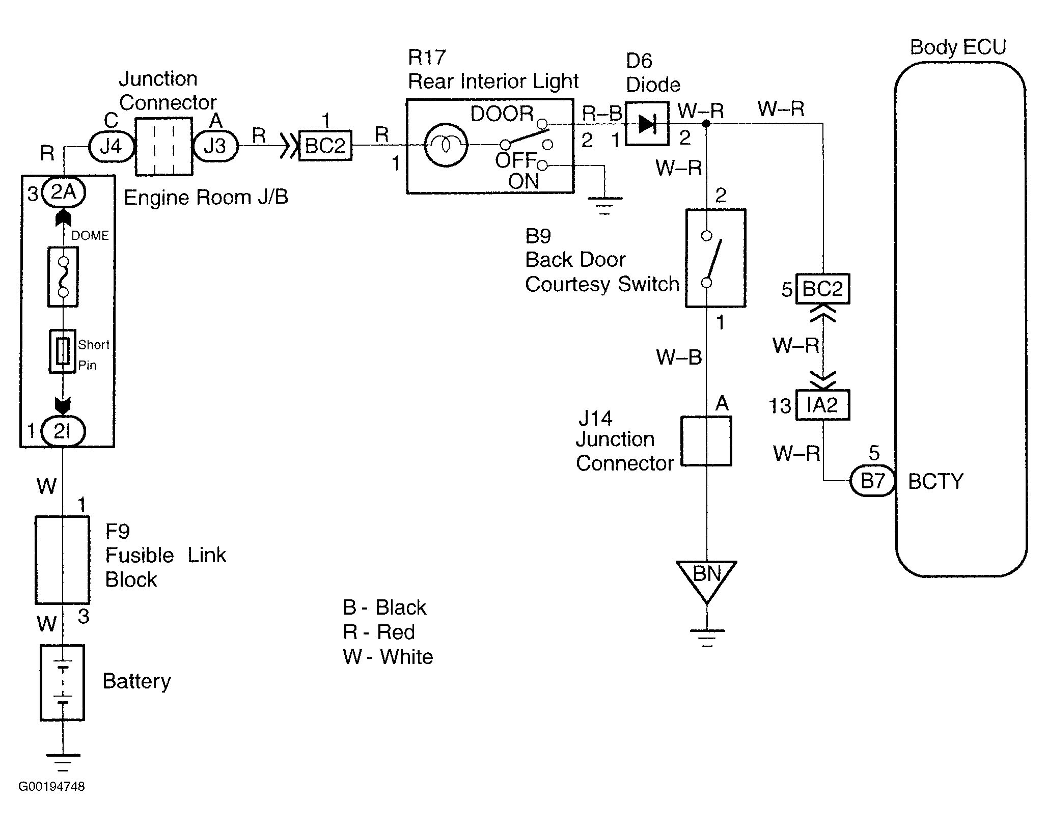 The back door courtesy switch goes on when the back door is opened and goes off when the back door is closed. See Fig 1.