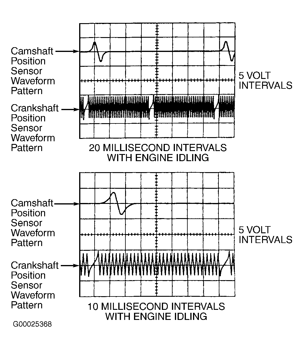 If oscilloscope is available, camshaft position sensor operation may be checked by reading camshaft position sensor waveform pattern with engine idling. This may be done by monitoring the camshaft position sensor signal which may be referred to as the G2 signal. Camshaft position sensor waveform pattern may be checked by connecting oscilloscope between terminals No. 10 (Yellow wire) and No. 24 (Blue wire) at ECM electrical connector E8. This is the G2 and G- terminals on ECM. ECM is located behind glove box and heater duct. See Figure. For ECM electrical connector terminal identification, see Figure. Camshaft position sensor waveform patterns should be properly displayed. See Figure.