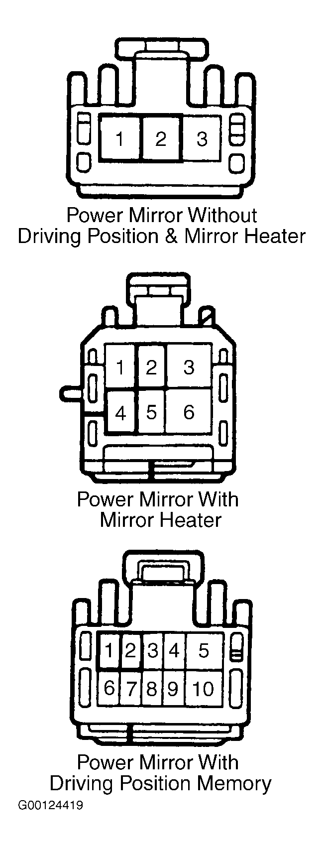 1. Turn ignition off. Disconnect power mirror motor 10-pin electrical harness connector. Using jumper wires, connect positive battery voltage to power mirror terminal No. 1 and connect negative battery voltage to power mirror terminal No. 2. See Figure. Mirror should turn to the left. Reverse polarity of jumper wires and check that mirror turns to the right.