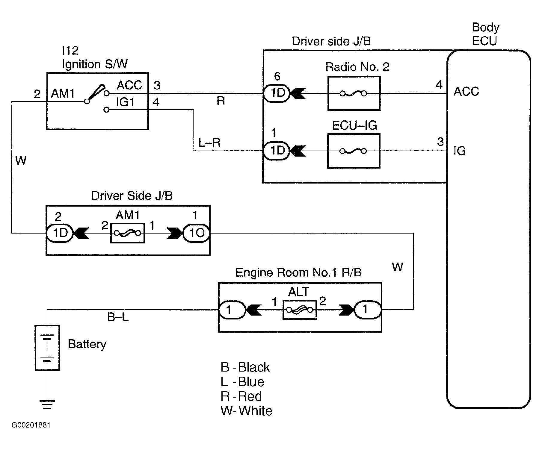 When the ignition switch is turned to the ACC position, battery positive voltage is applied to the terminal No. 4 (ACC) of the body ECU and when the ignition switch is turned to the ON position, battery positive voltage is applied to terminal No. 3 (IG) of the body ECU. For circuit diagram, see Fig 1.