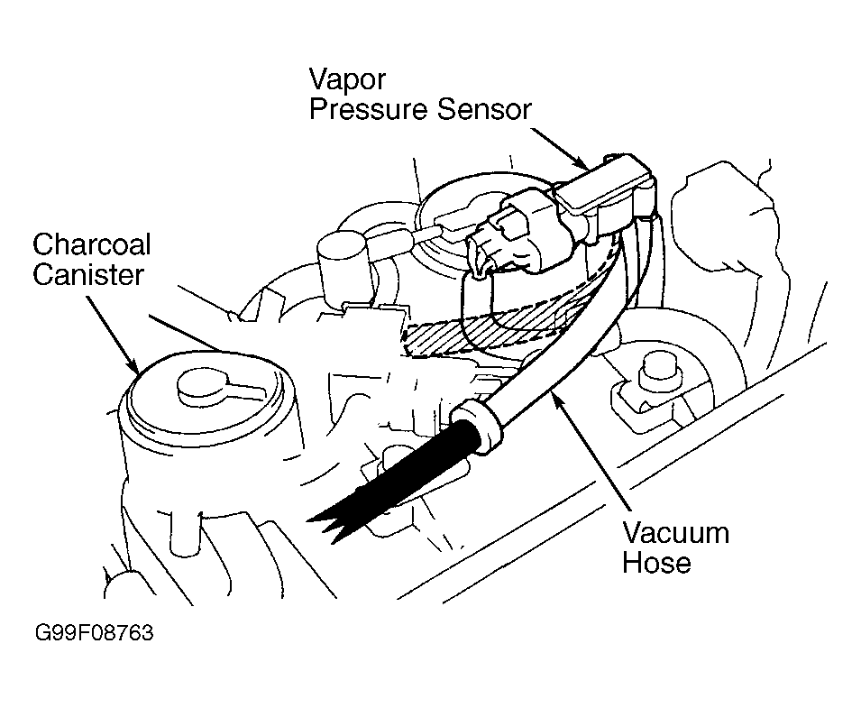 - Ensure ignition is off. To test vapor pressure sensor supply voltage, disconnect electrical connector at vapor pressure sensor. Sensor is located on rear corner of charcoal canister and contains a Black 3-pin connector. See Figure.