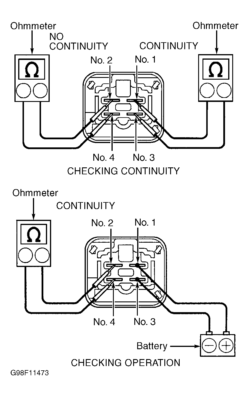 3. To test EFI main relay operation, apply battery voltage and ground to EFI relay and use ohmmeter to check continuity between specified terminals on EFI main relay. See Fig 1. Replace EFI main relay if defective.