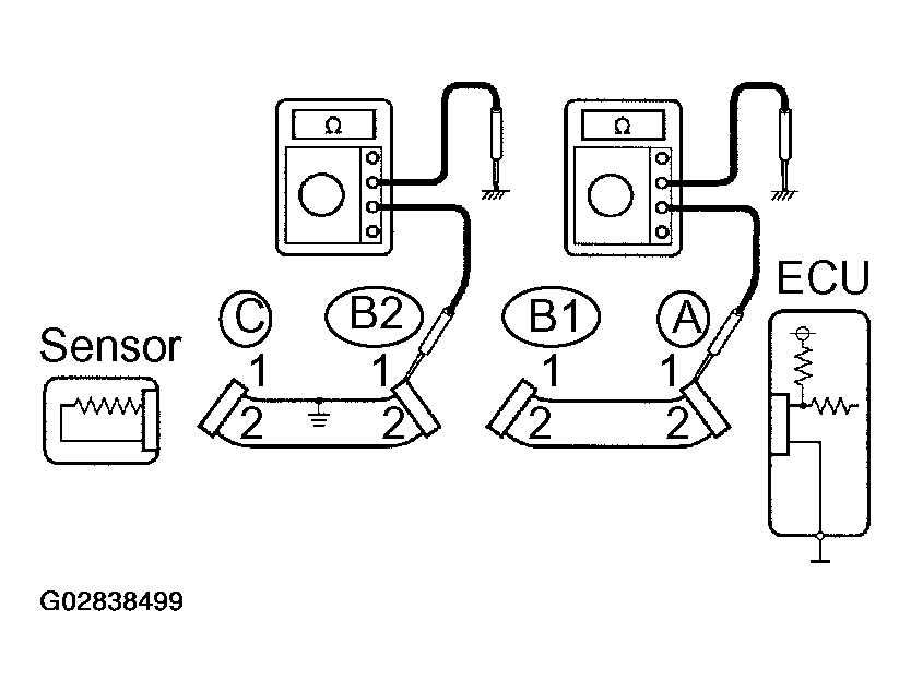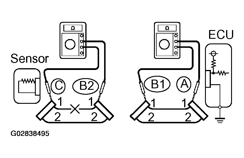 Therefore, it is found out that there is an open circuit between terminal 1 of connector "B2" and terminal 1 of connector "C".