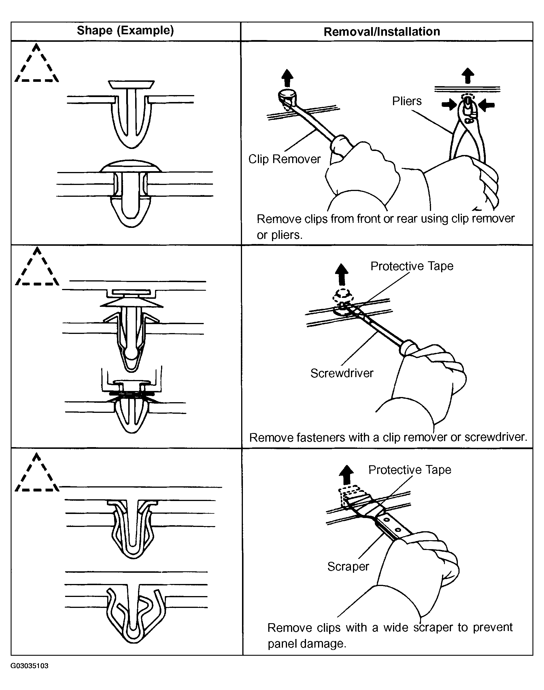 - The removal and installation methods of typical clips used in body parts are shown in Fig 6 .