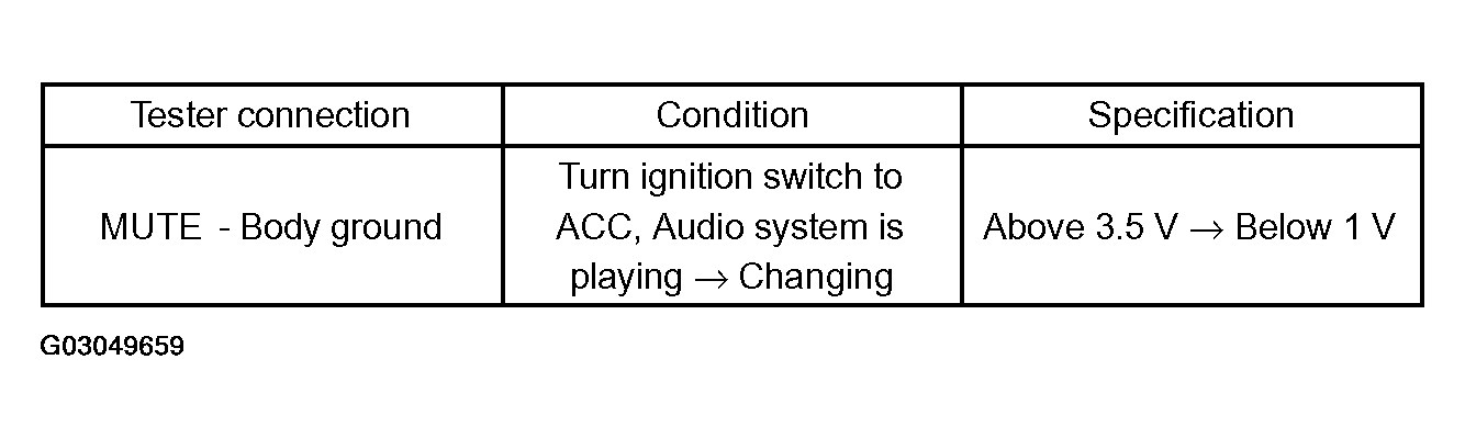 SPECIFIED CONDITIONTester connection Condition Specification MUTE - Body ground Turn ignition switch to ACC Above 3.5 V
