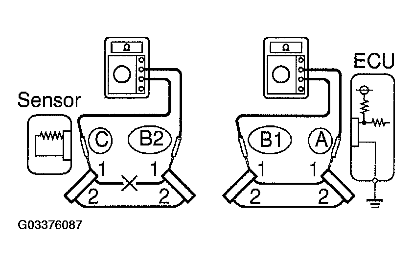Therefore, it is found out that there is an open circuit between terminal 1 of connector "B2" and terminal 1 of connector "C".