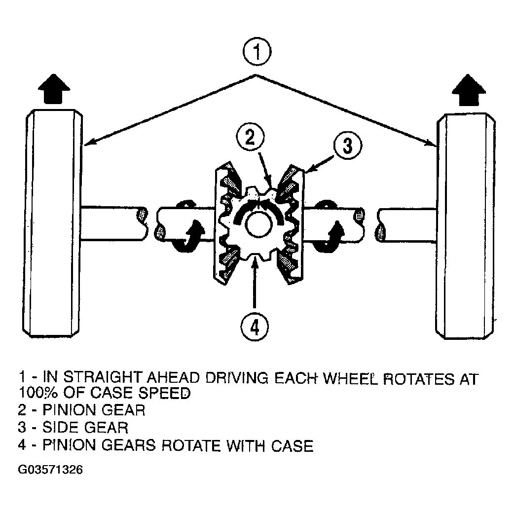 During straight-ahead driving, the differential pinion gears do not rotate on the pinion mate shaft. This occurs because input torque applied to the gears is divided and distributed equally between the two side gears. As a result, the pinion gears revolve with the pinion mate shaft but do not rotate around it (Fig 1 ).