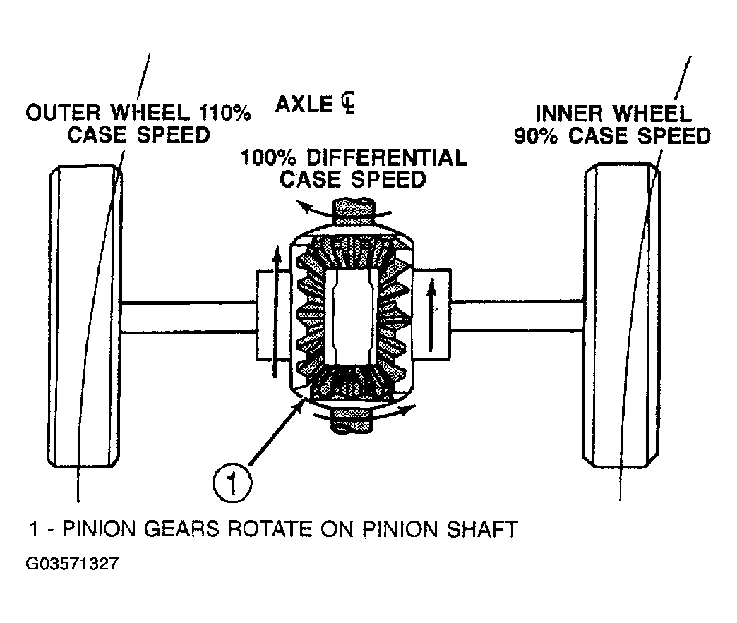 When turning corners, the outside wheel must travel a greater distance than the inside wheel to complete a turn. The difference must be compensated for to prevent the tires from scuffing and skidding through turns. To accomplish this, the differential allows the axle shafts to turn at unequal speeds (Fig 2 ). In this instance, the input torque applied to the pinion gears is not divided equally. The pinion gears now rotate around the pinion mate shaft in opposite directions. This allows the side gear and axle shaft attached to the outside wheel to rotate at a faster speed.