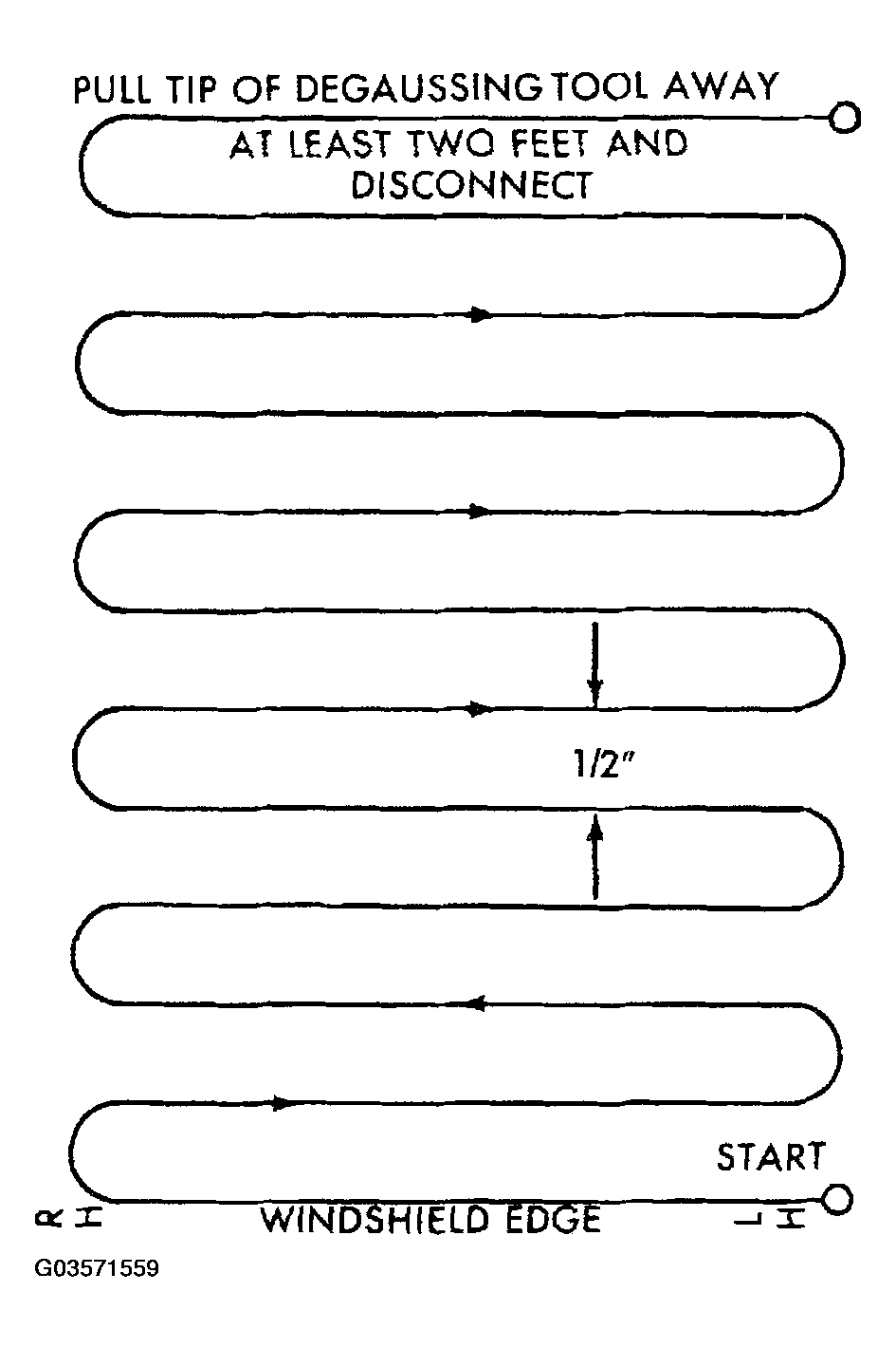 - Slowly approach the center line of the roof panel at the windshield header, with the degaussing tool connected.
