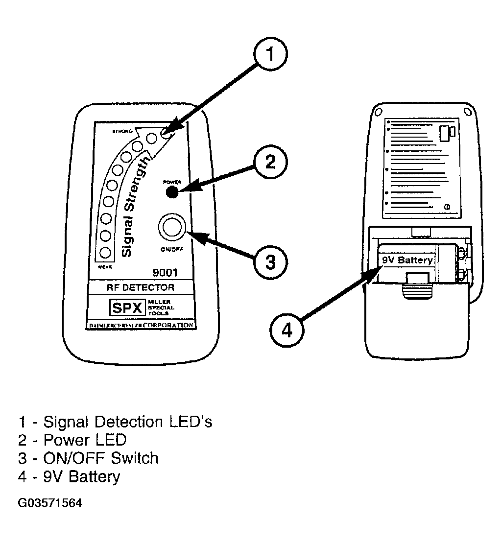 If the Universal Transmitter is inoperative, but the tire pressure monitoring system and compass are operating normally, refer to STANDARD PROCEDURE - SETTING TRANSMITTER CODES . Retrain the Transmitter with a known good transmitter and test the Transmitter operation again. If the Universal Transmitter, Tire Pressure monitoring and compass are inoperative, refer to DIAGNOSIS AND TESTING - OVERHEAD CONSOLE for diagnosis. For complete circuit diagrams, refer to SYSTEM WIRING DIAGRAMS . If the universal-transmitter is inoperative, test the transmitter with special tool Radio Frequency Detector (Figure ). Procedure is as follows: