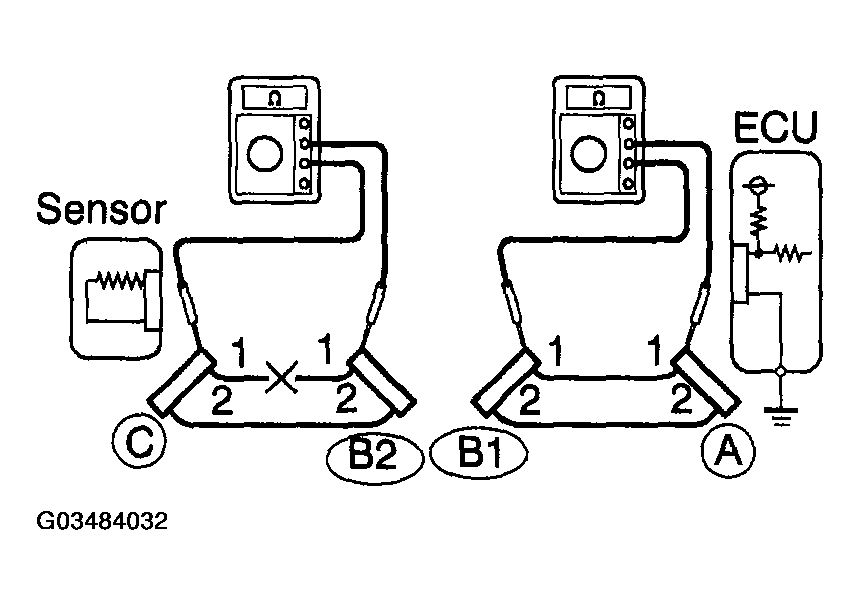- Disconnect connector B and measure the resistance between terminal 1 of connector A and the body ground, and terminal 1 of connector B2 and the body ground.