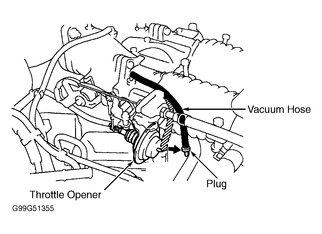 Start engine and warm engine to normal operating temperature. Ensure idle speed is 650-750 RPM. Disconnect and plug vacuum hose at throttle opener near throttle body. See Fig 1. Note engine speed. Engine speed should be 1100-1700 RPM. If engine speed is not 1100-1700 RPM, replace throttle body. See THROTTLE BODY under FUEL SYSTEM in REMOVAL & INSTALLATION - EXCEPT GX470 article.