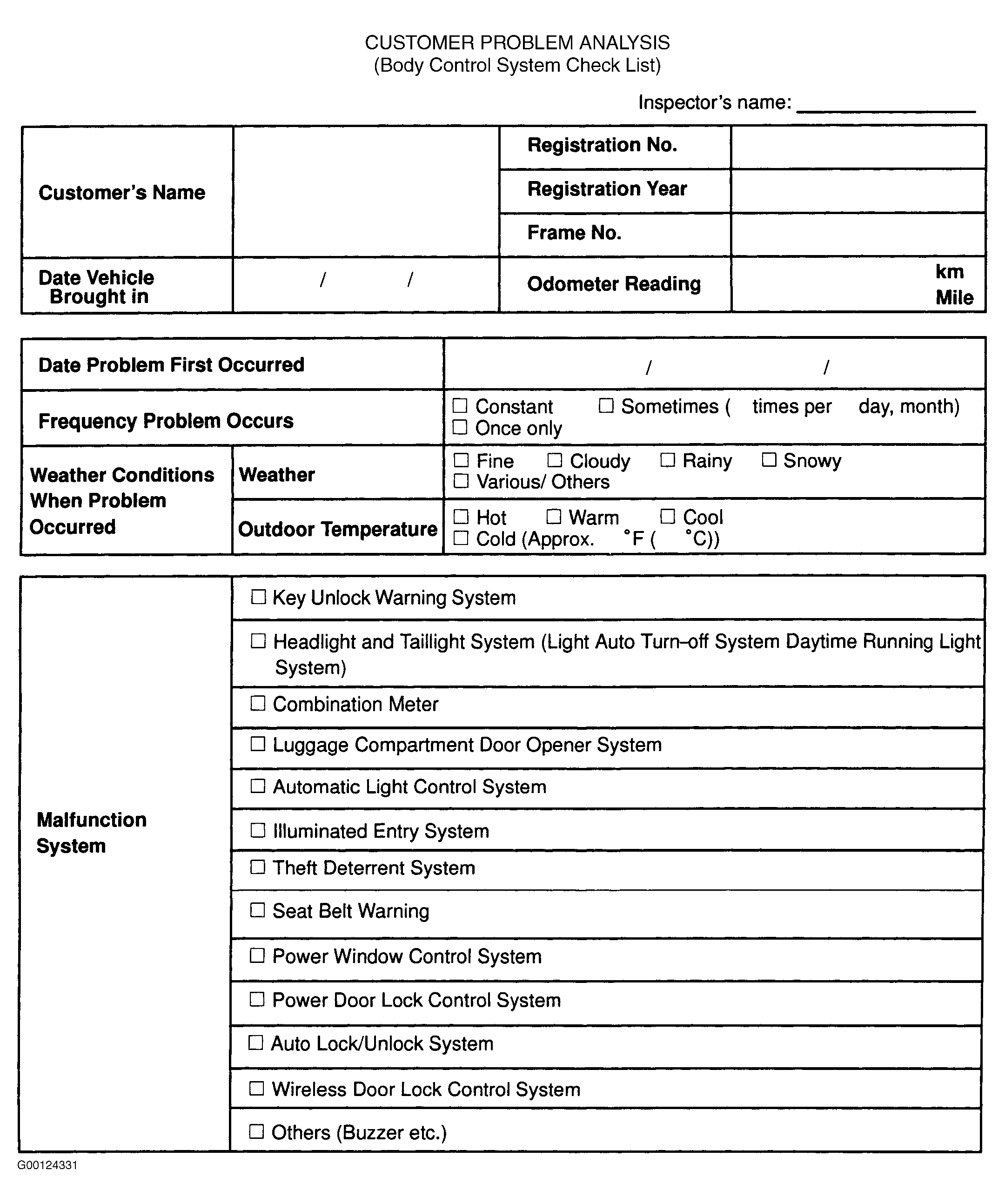 1. Trouble shooting of a body control system complaint begins with verification of the customer problem. Perform Customer Problem Analysis (Body Control System Check List). See Fig 1. If problem occurs, go to step  3. If problem does not occur, go to next step.