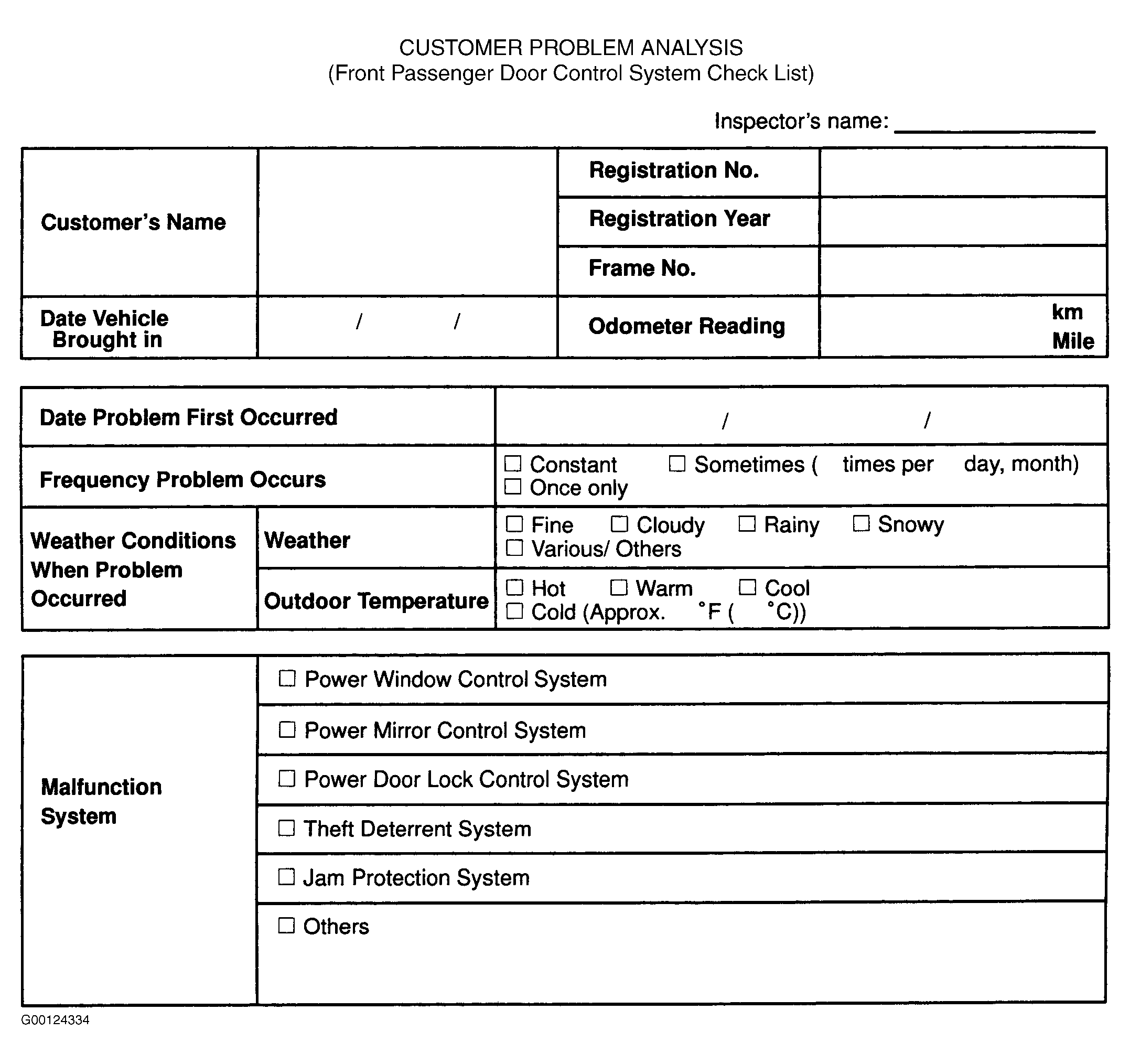1. Trouble shooting of a front passenger door control system complaint begins with verification of the customer problem. Perform Customer Problem Analysis (Front Passenger Door Control System Check List). See Fig 1. If problem occurs, go to step  3. If problem does not occur, go to next step.