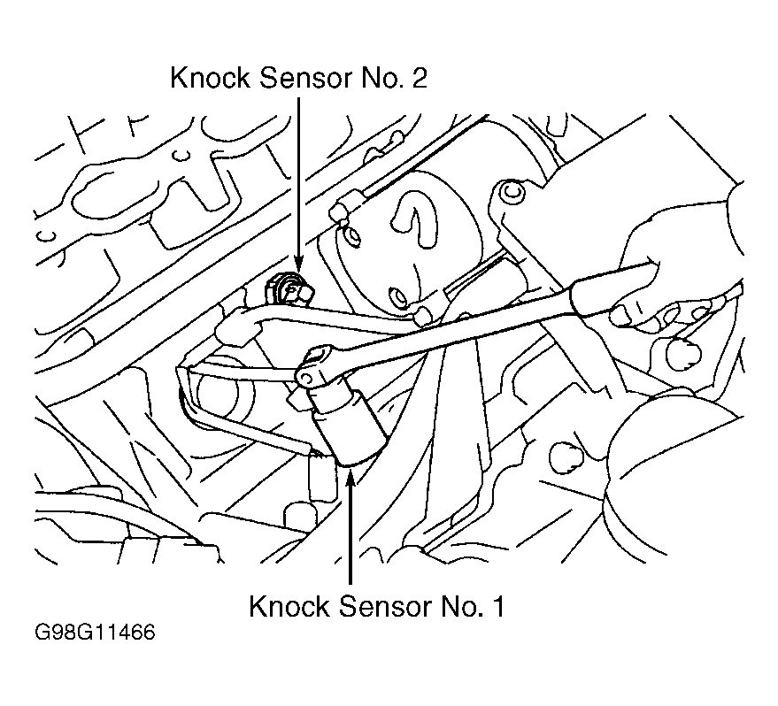 5. Check for open and short in wiring harness and electrical connectors between EC1 electrical connector and knock sensor No. 2. See WIRING DIAGRAMS article. Knock sensor No. 2 is located below intake manifold on cylinder block. See Figure. If wiring harness or electrical connector is defective, repair as necessary. If wiring harness and electrical connectors are okay, replace knock sensor No. 2. See KNOCK SENSOR under ENGINE SENSORS & SWITCHES in REMOVAL, OVERHAUL & INSTALLATION - V6 & V8 article.