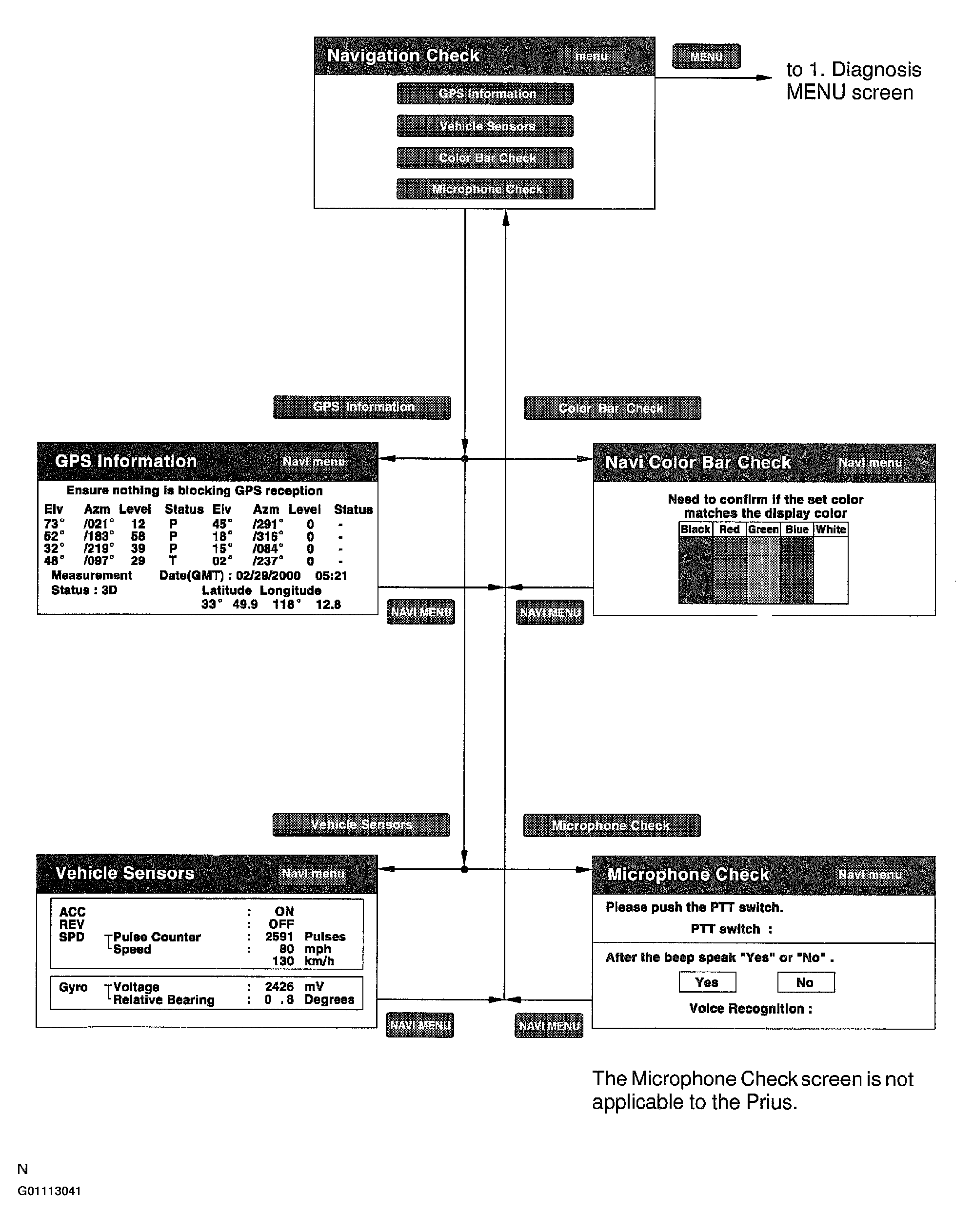 1. Status of the vehicle sensor which are input to the Navigation ECU is checked in this screen.