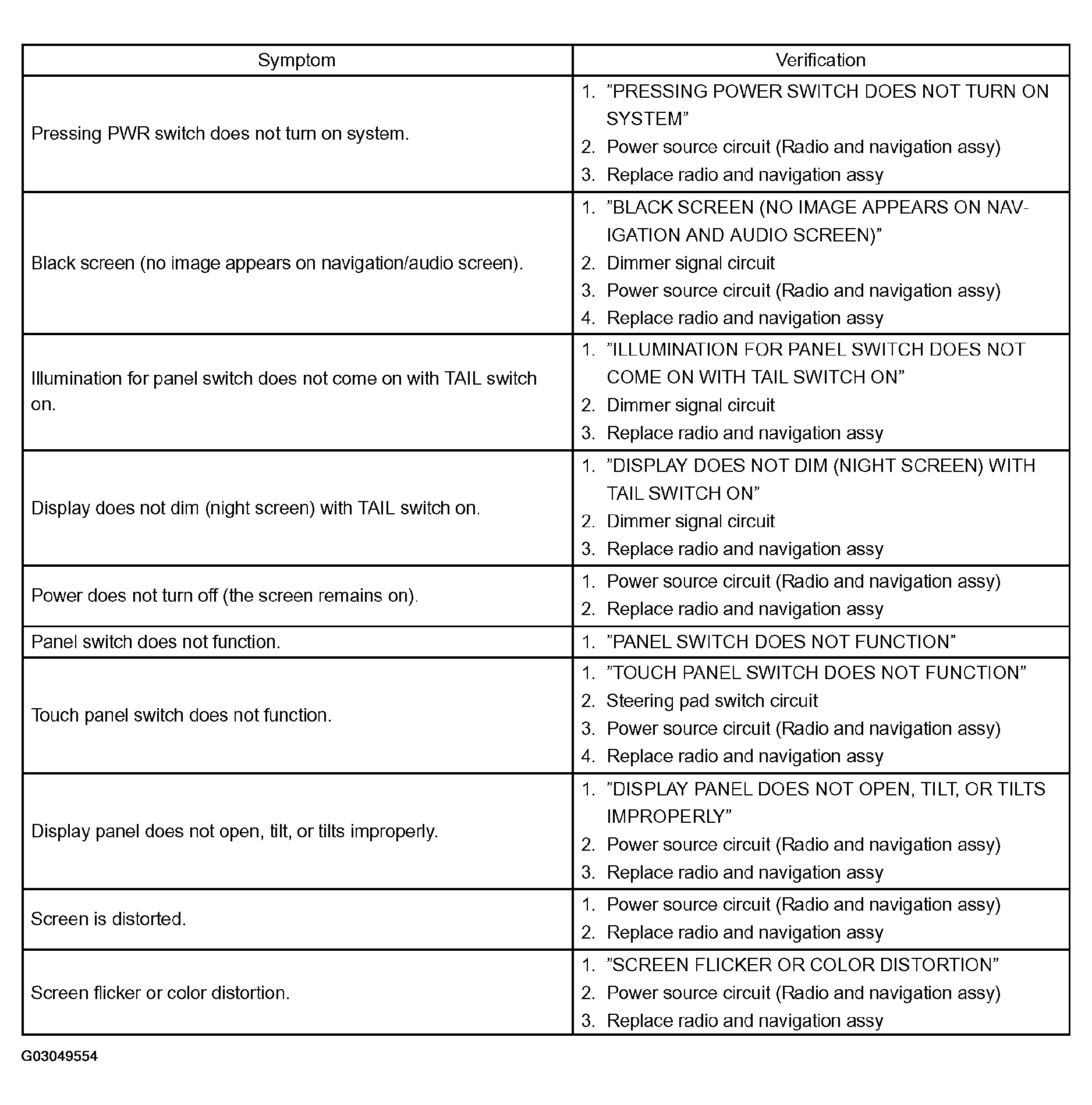 Home >> Toyota >> 2004 >> Matrix Base, FWD, Standard >> Repair and Diagnosis >> External Pages >> Different car >> Section 695 (Navigation System - Diagnostics) >> Problem Symptoms Table
