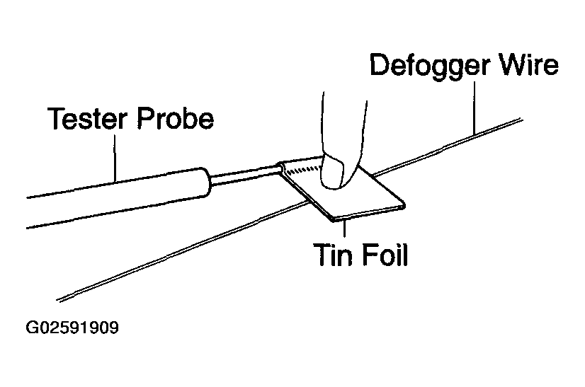 If the defogger wire is not broken, the voltmeter should indicate 0 V at the positive (+) end of the defogger wire and gradually increases to approximately 12 V as the meter probe moves to the other end.