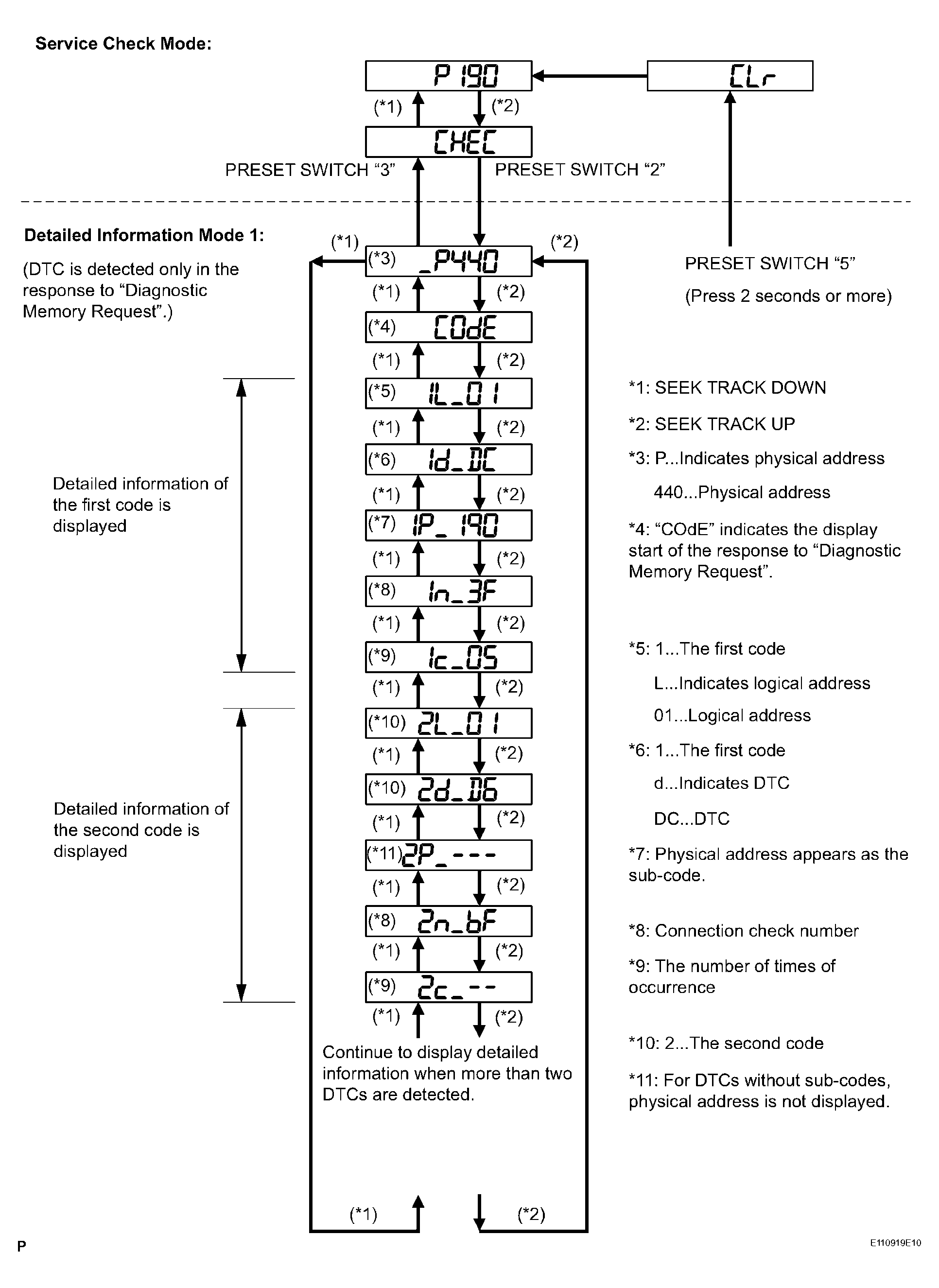 1. When the preset switch "5" is pressed for 2 seconds or more during "Service Check Mode", the DTCs for all components are cleared. ("CLr" is displayed at this time.)