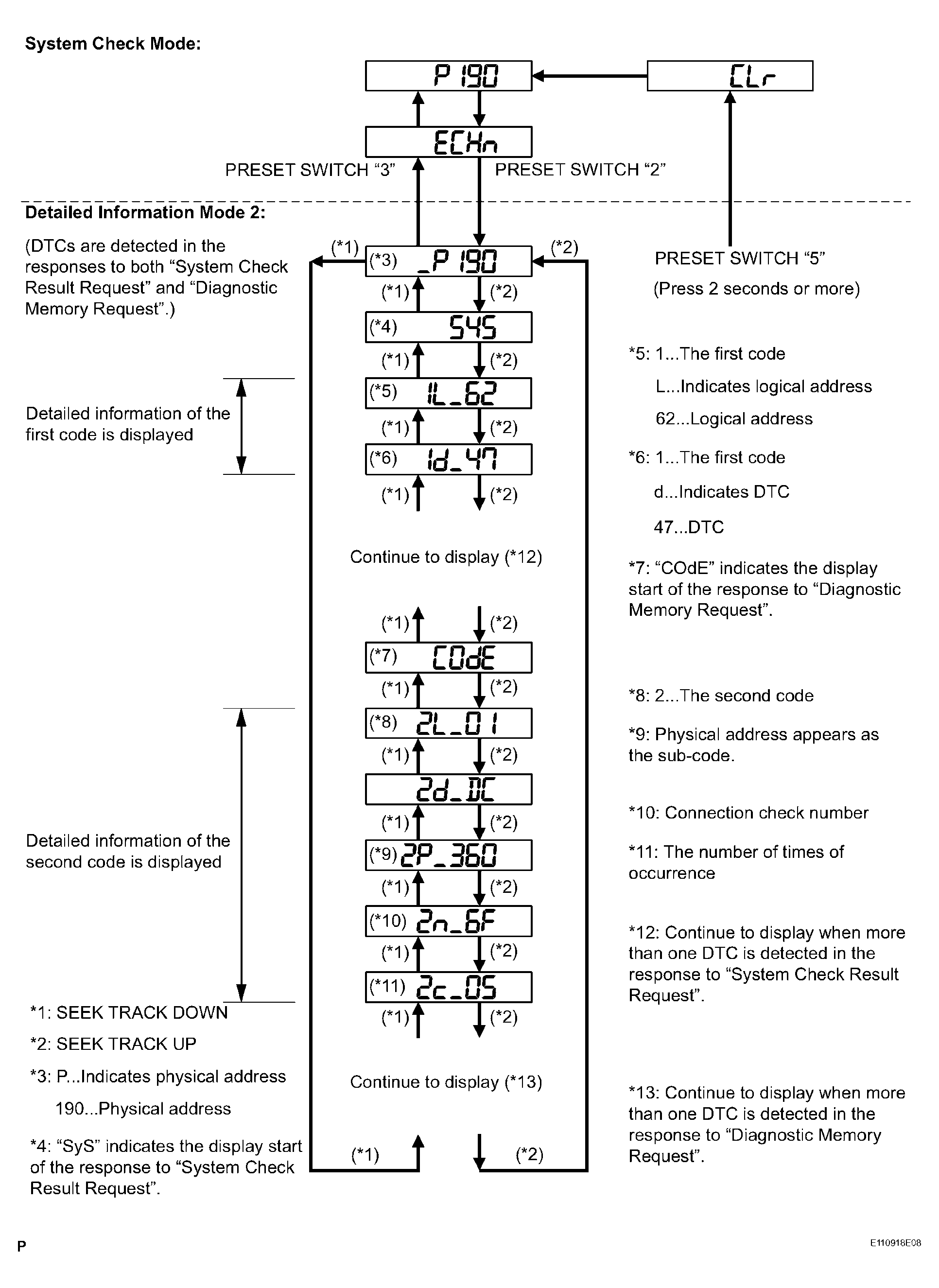 • "Detailed information mode 2" is displayed when DTCs are detected in the responses to both "System Check Result Request" and "Diagnostic Memory Request".