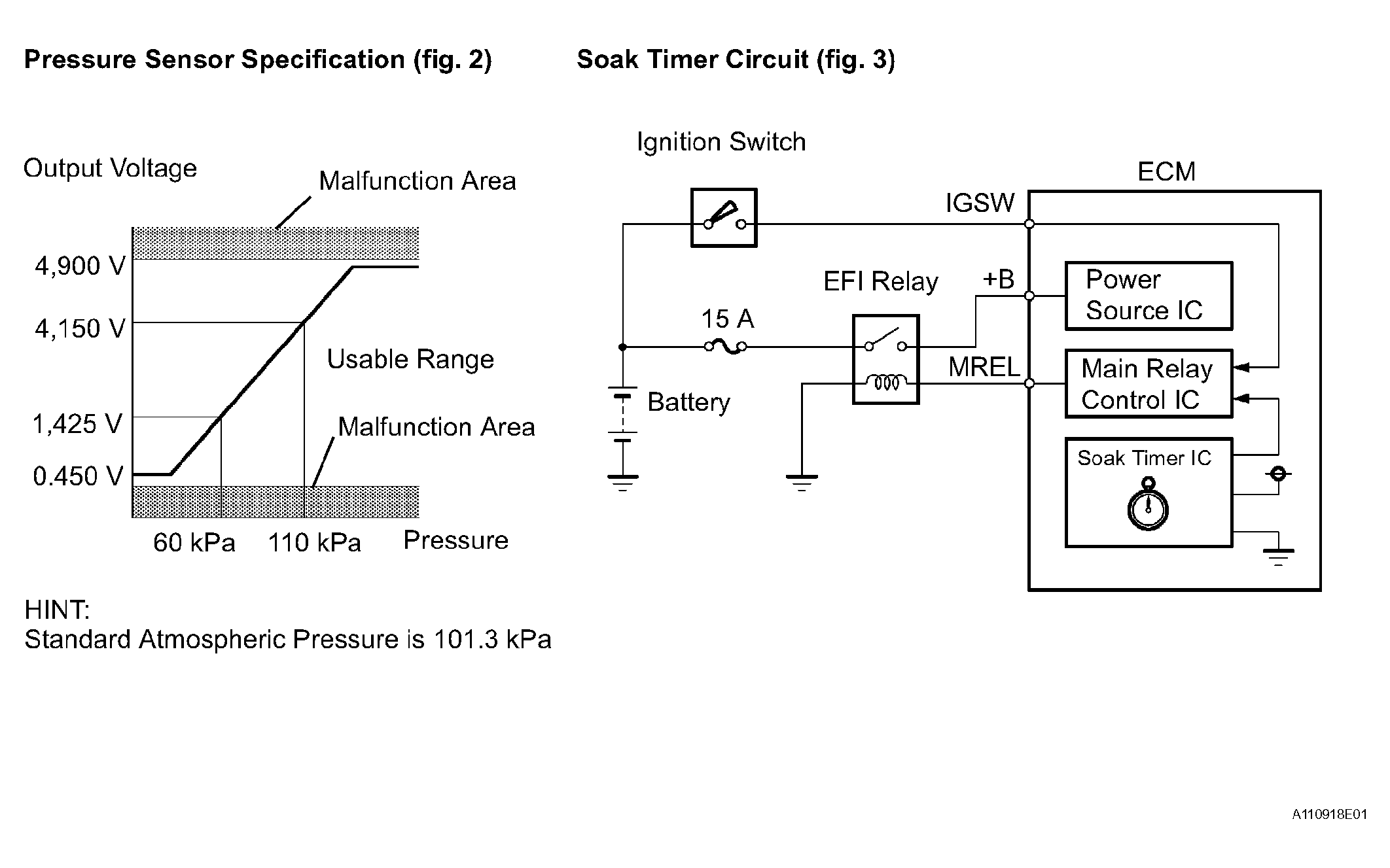 (b) Pressure sensor Indicates pressure as voltages. ECM supplies regulated 5 V to pressure sensor, and uses feedback from sensor to monitor EVAP system pressure (refer to Fig 5).
