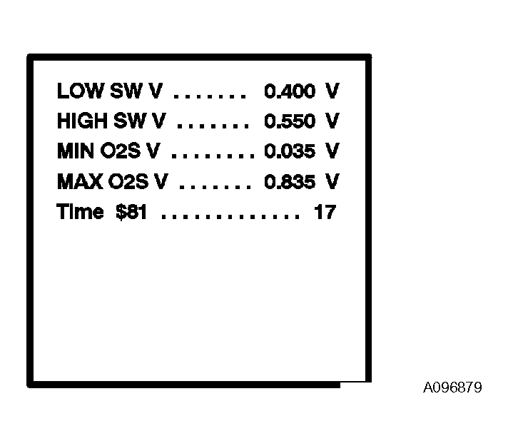 NOTE: Until the HO2 sensor monitor runs to completion, when it fails to complete or when the ignition switch is turned to OFF, the tester screen displays the upper and lower viewable limit values for the monitor (for example, voltages: 0 V and 1.275 V, seconds: 0 and 10.2, and Test Value: 0 and 255).