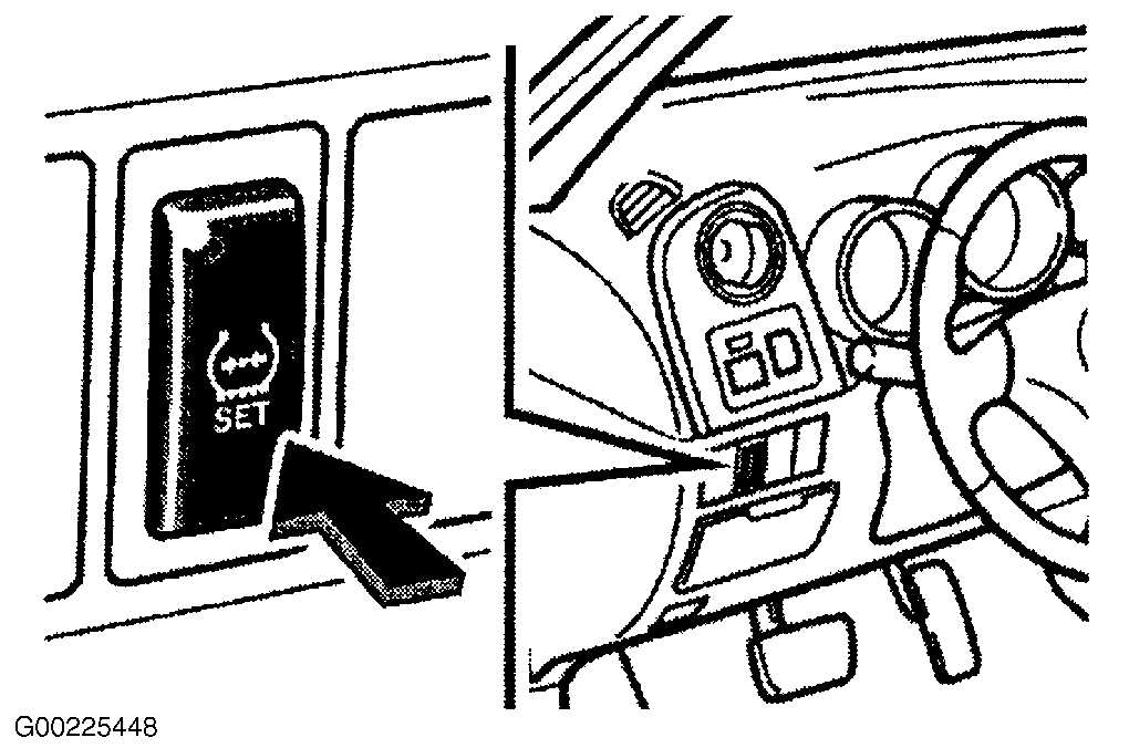 3. Within 30 seconds of turning the ignition ON, press and hold the tire pressure warning reset switch until the tire pressure warning light blinks 3 times at one-second intervals. See Fig 1 or Fig 2.