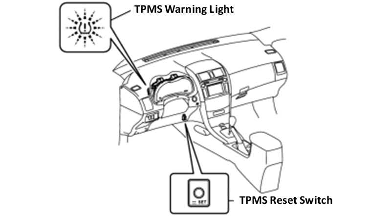 CAUTION: Set tire pressure within the specified range before initializing. DO NOT push the reset switch without adjusting tire inflation pressure of all 4 tires. Otherwise, the low tire pressure warning light may not come on even if the tire pressure is low, or it may come on when the tire inflation pressure is actually normal. If you push the reset switch while the vehicle is moving, initialization is not performed.