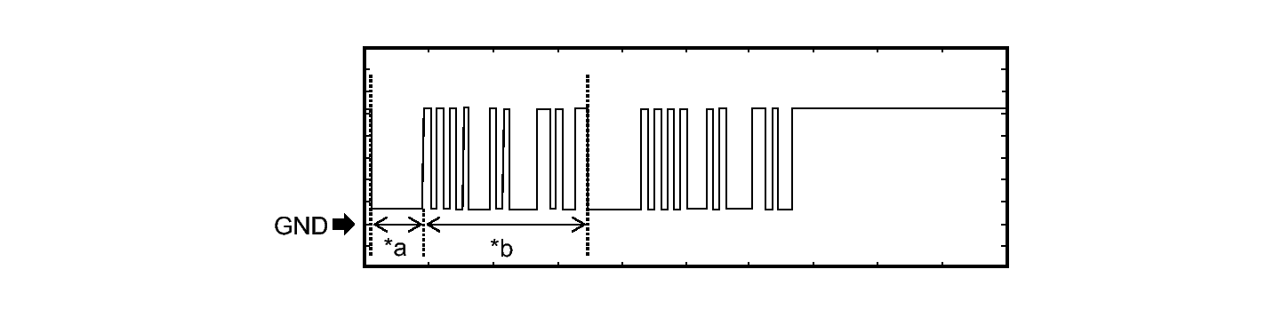 *a Approximately 160 ms *b Approximately 510 ms MEASUREMENT CONDITIONItem Content Tester Connection L6-20 (IMO) - L5-6 (E1) Tool Setting 2 V/DIV., 200 ms./DIV. Condition Within 3 seconds of hybrid control system start or within 3 seconds of power switch turned on (IG) after auxiliary battery cable disconnected and reconnected - Waveform 2 (Reference)TEXT IN ILLUSTRATION