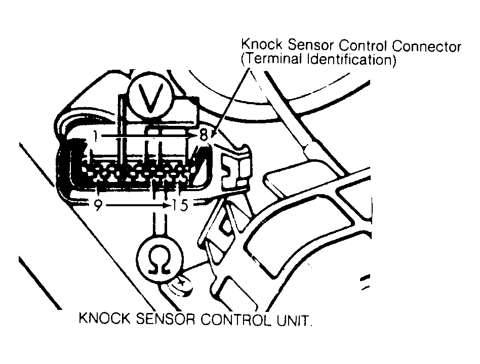 1. Check ignition coil and Hall Effect sender before checking knock sensor control unit. Remove knock sensor control unit harness connector. Turn ignition on. Using a voltmeter, check for battery voltage between terminals No. 3 and No. 5 and terminals No. 6 and No. 3 of knock sensor control unit. Open throttle valve. Voltage should drop to zero volts.