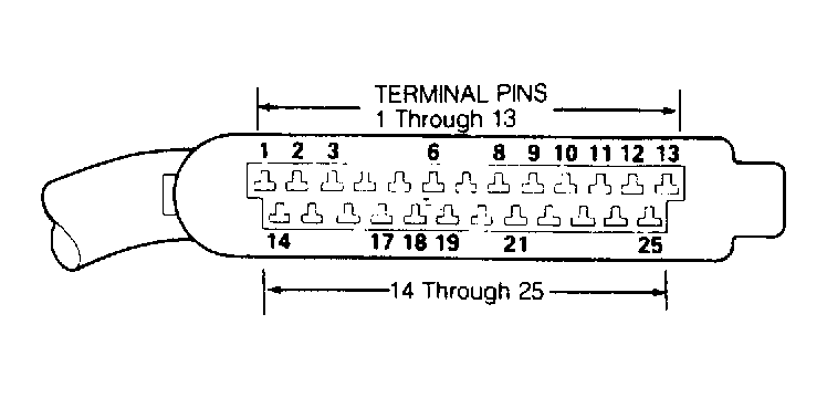 Using Multimeter (US 1119), check resistance of ground connections for ECU. Remove ECU connector. Check continuity to ground on terminals No. 13 and 19. See Figure . Resistance should be zero ohms. If resistance is not zero ohms, repair open or short in wiring.