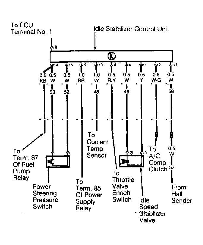 3. Test light should be on when A/C switch is in on position. If light is on, replace idle stabilization valve. If light does not go on, repair wiring between idle stabilization control unit terminal No. 2 and A/C compressor clutch.