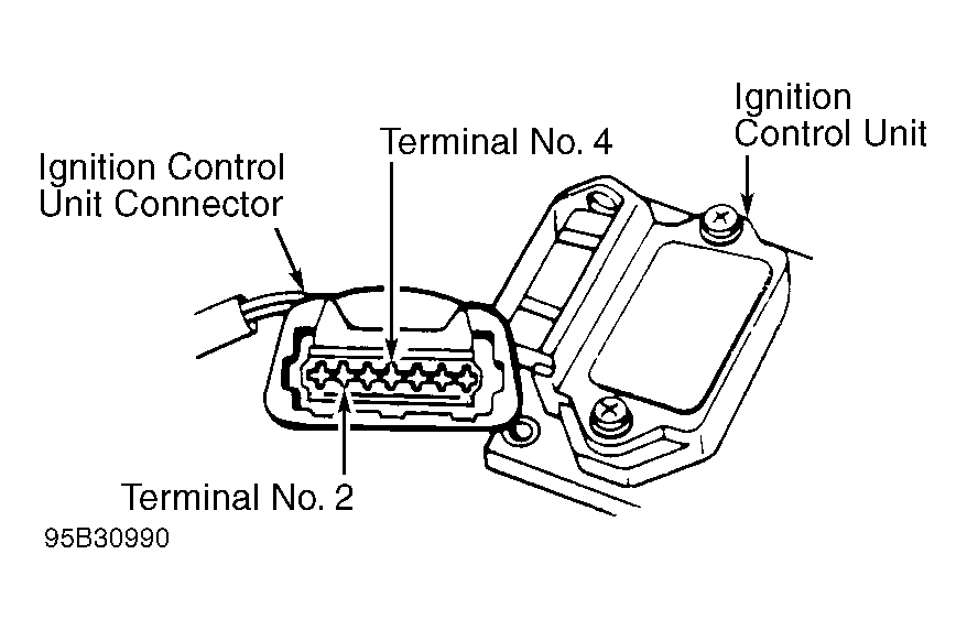 - Battery voltage should be present. If battery voltage is not present, ensure continuity exists between terminal No. 2 and ground. Continuity must also exist between terminal No. 4 and ignition coil positive terminal. Repair wiring if necessary. If wiring is okay, replace ignition control unit.