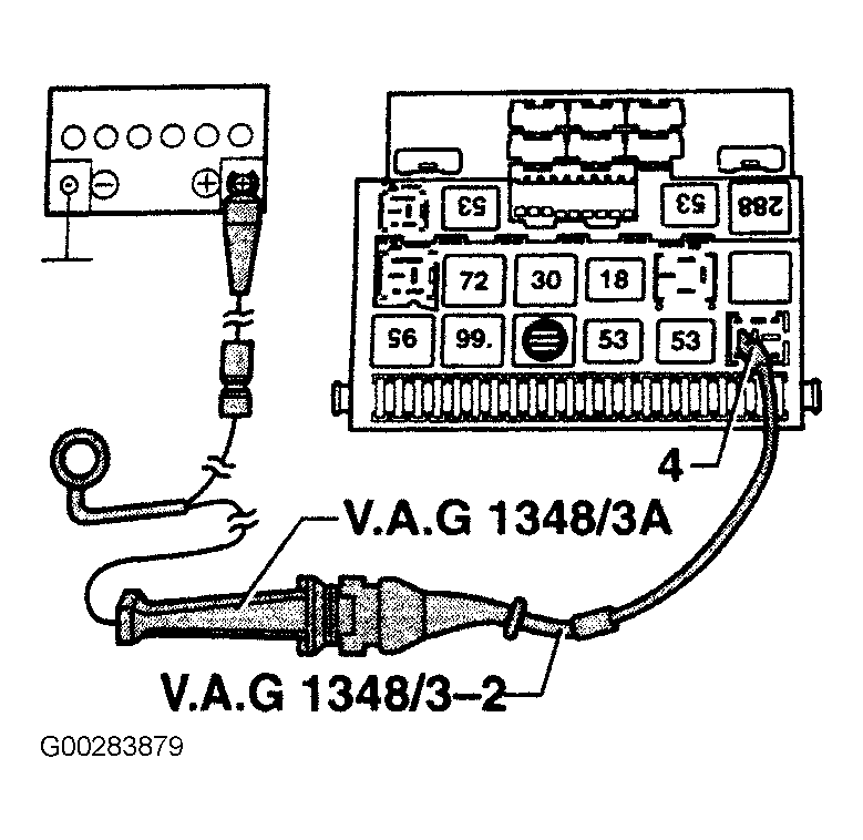 - Remove fuel pump relay from relay panel. Connect Remote Control Switch (VAG 1348) between battery positive source and fuel pump terminal. See Fig 2 .