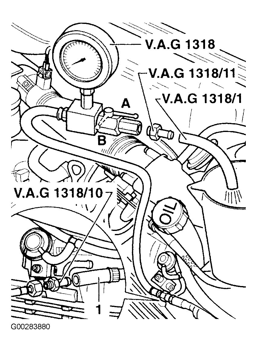 - Connect Pressure Gauge (VAG 1318), or equivalent, at fuel supply line/hose in engine compartment. Ensure shut-off lever is open (position A), and fuel hose is in a measuring container. See Fig 1 .