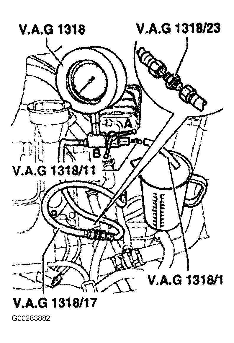 - If minimum fuel pump volume is not as specified, check fuel lines for possible restrictions, kinks or blockages. Connect Pressure Gauge (VAG 1318), or equivalent, at fuel filter. See Figure .