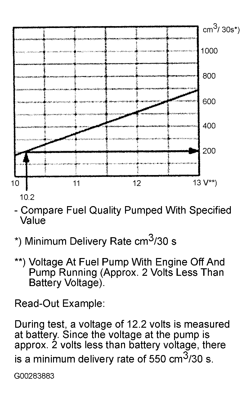 - Connect DVOM to battery terminals. Activate fuel pump for 30 seconds while collecting fuel in measuring container and measure battery voltage. Record fuel volume and battery voltage.