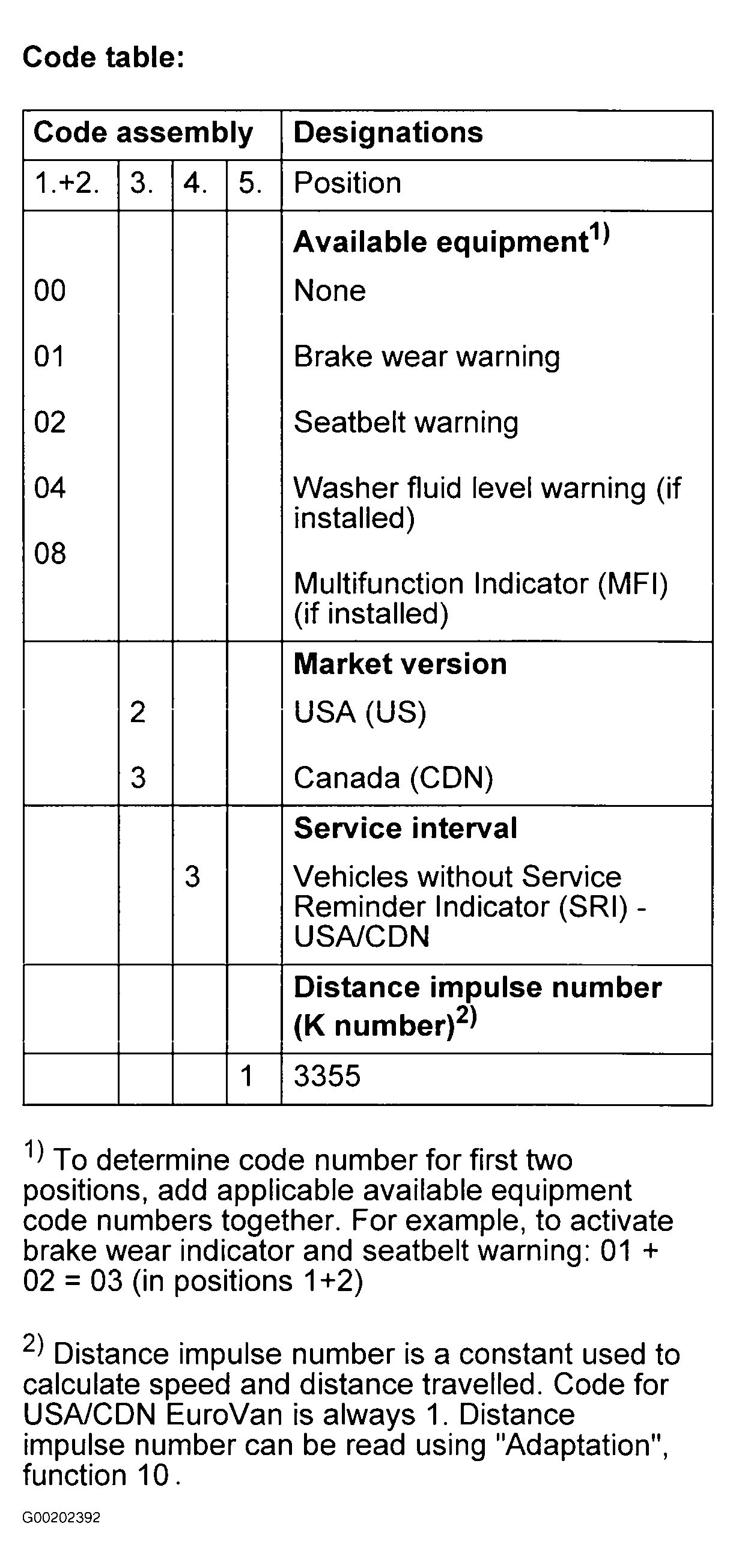 The code table lists only those combinations applicable to the VW EuroVan. Coding adjusts the various combination possibilities according to trip impulse number and optional equipment.