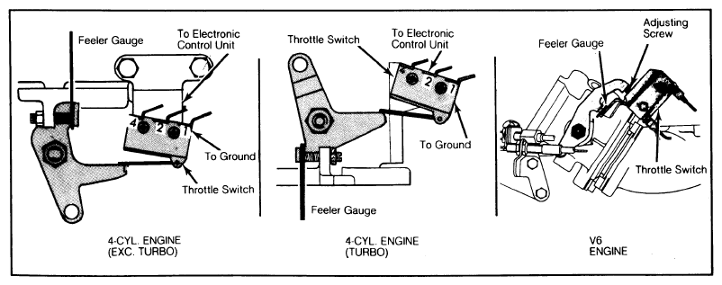 - Using feeler gauge listed in Throttle Switch Voltage Reading chart should produce voltages indicated in chart. If not, replace throttle switch and adjust as follows: