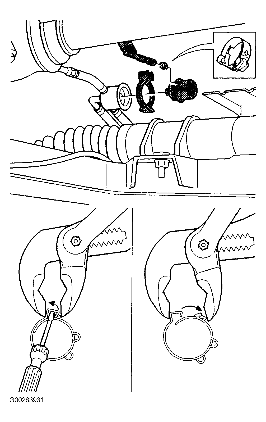 - Remove small clamp by squeezing clamp with pliers and prying apart with screwdriver. See Fig 1. Clamp can be reused.